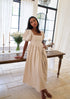 A lovely, demure piece that can be both dressed up and dressed down. Loose puffy sleeves and a dipped waistline add to its whimsical notes. Smocked at the back. Comes with concealed side pockets. Fully lined.